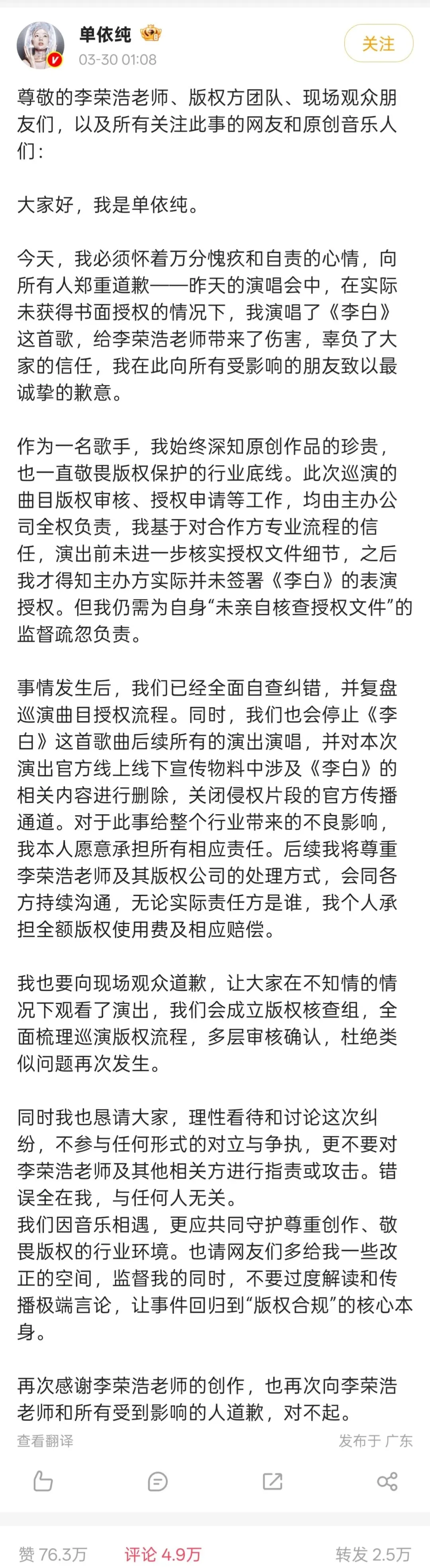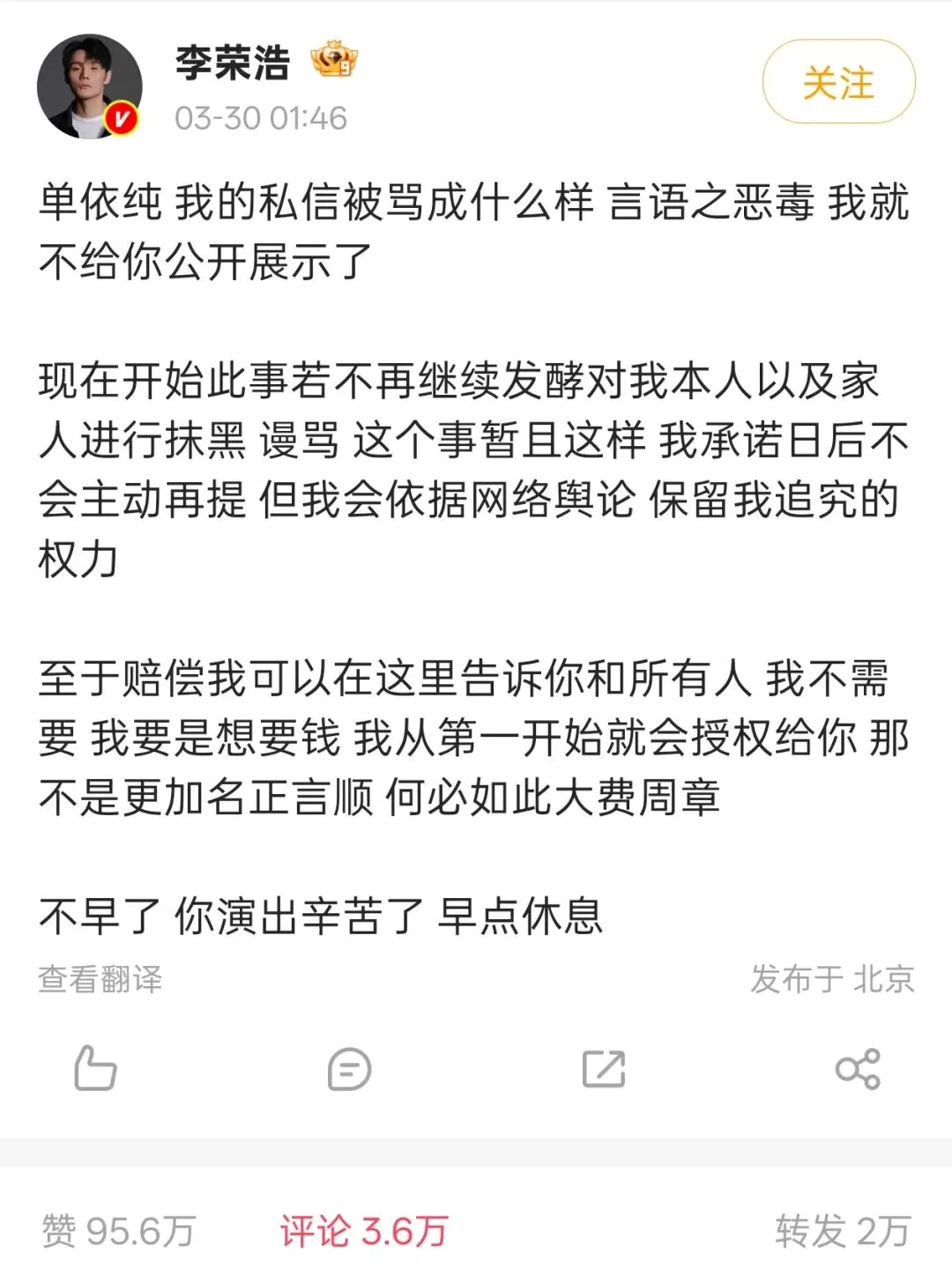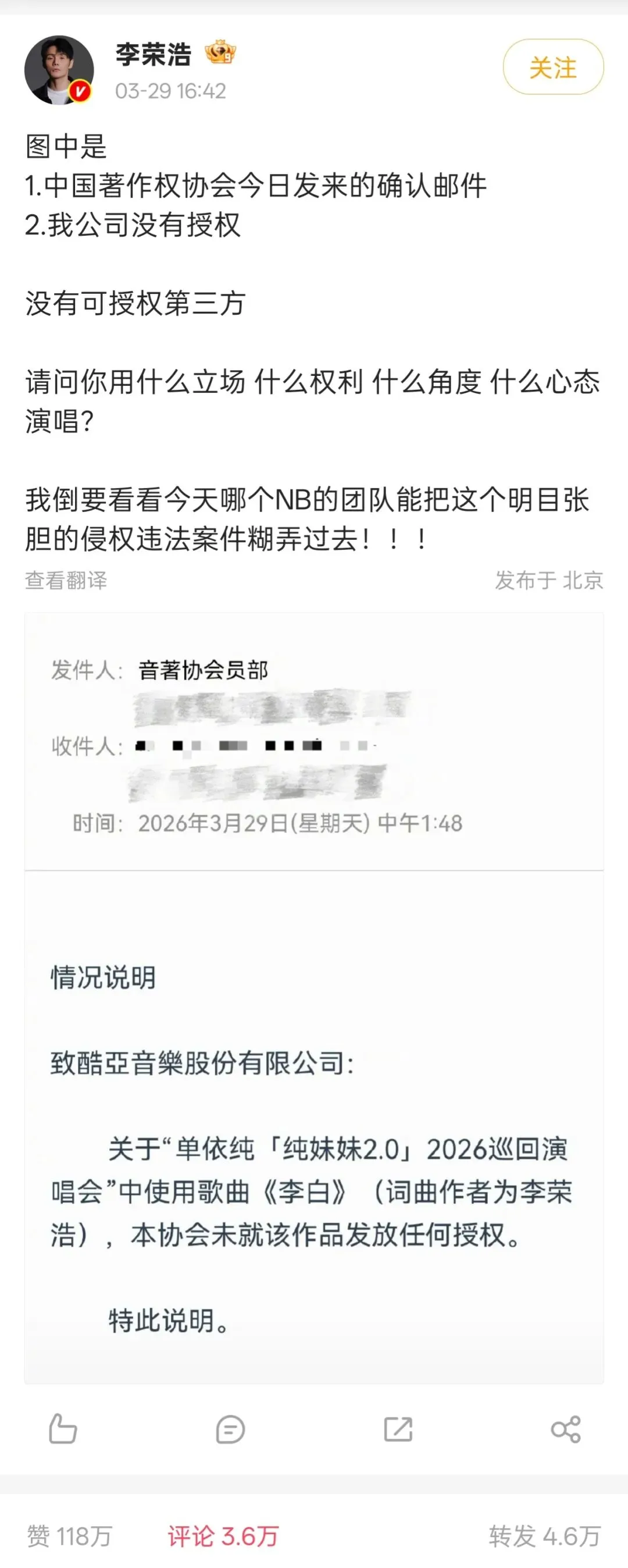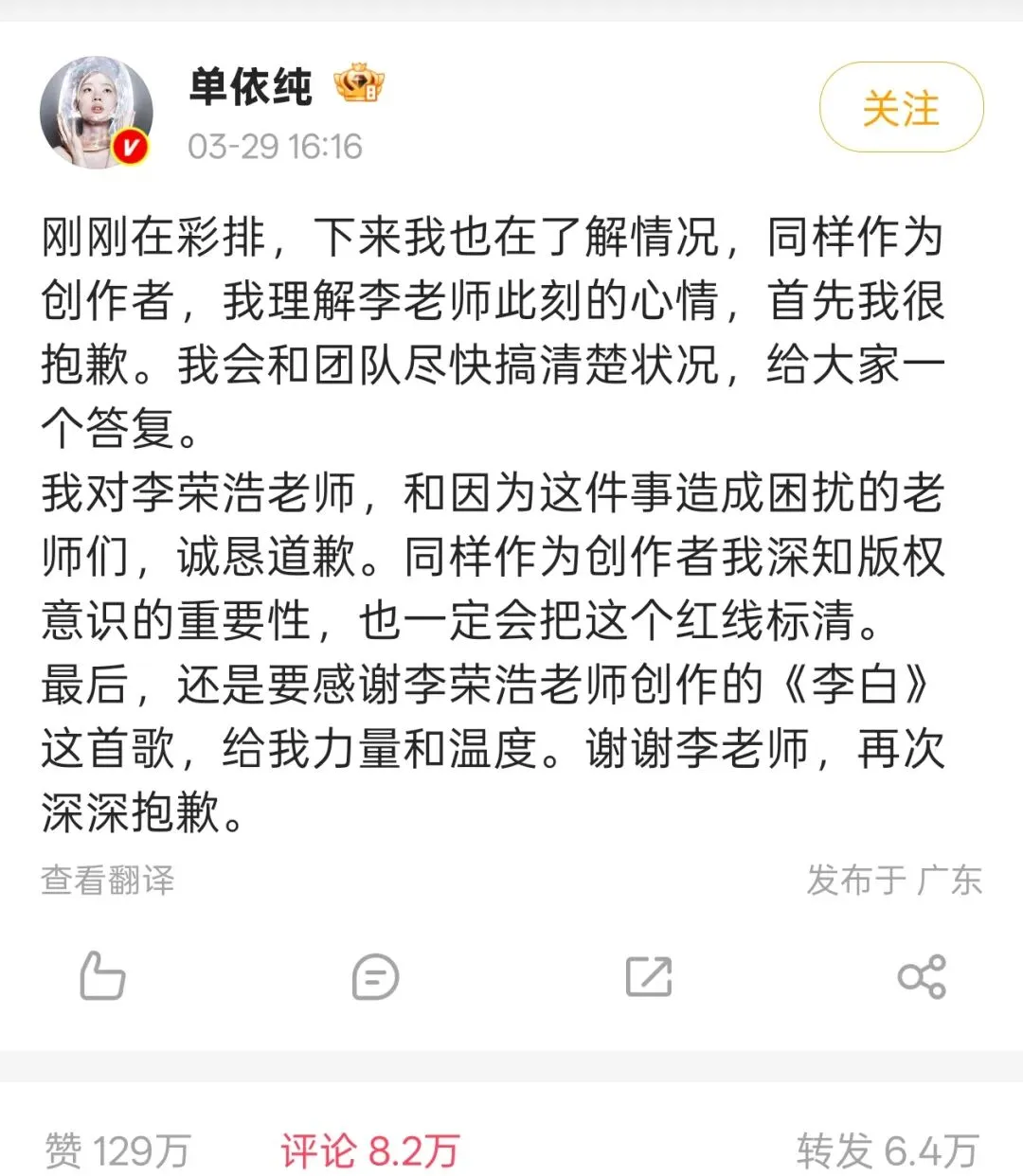 3.29下午14:37李荣浩发文指责单依纯侵权: