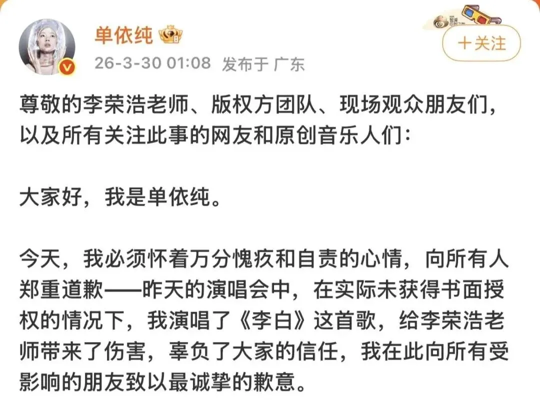 3月30日凌晨,单依纯发布长文正式致歉,承认团队版权核查失职,承诺停演、删物料并承担赔偿。