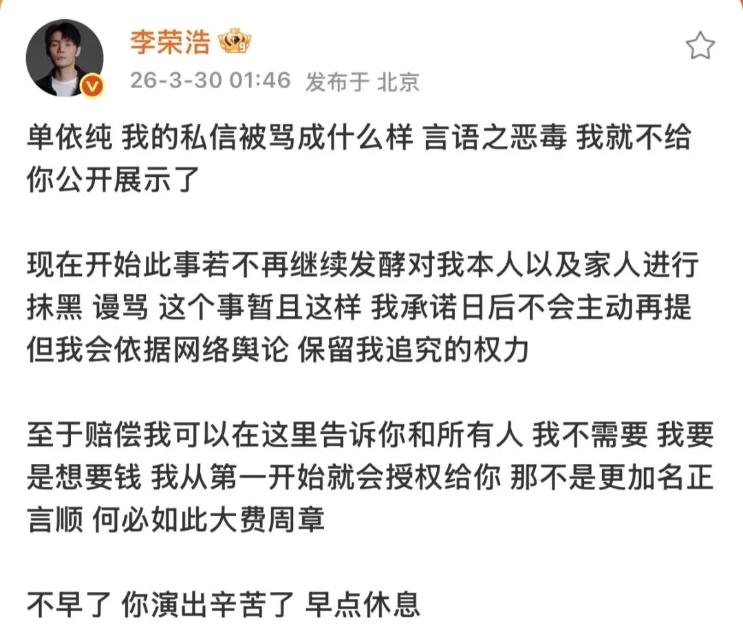 几十分钟后,李荣浩回应,接受道歉,拒绝赔偿且暂不追究,但同时曝光自己遭遇大规模网暴,将视网暴情况保留追责权利。
