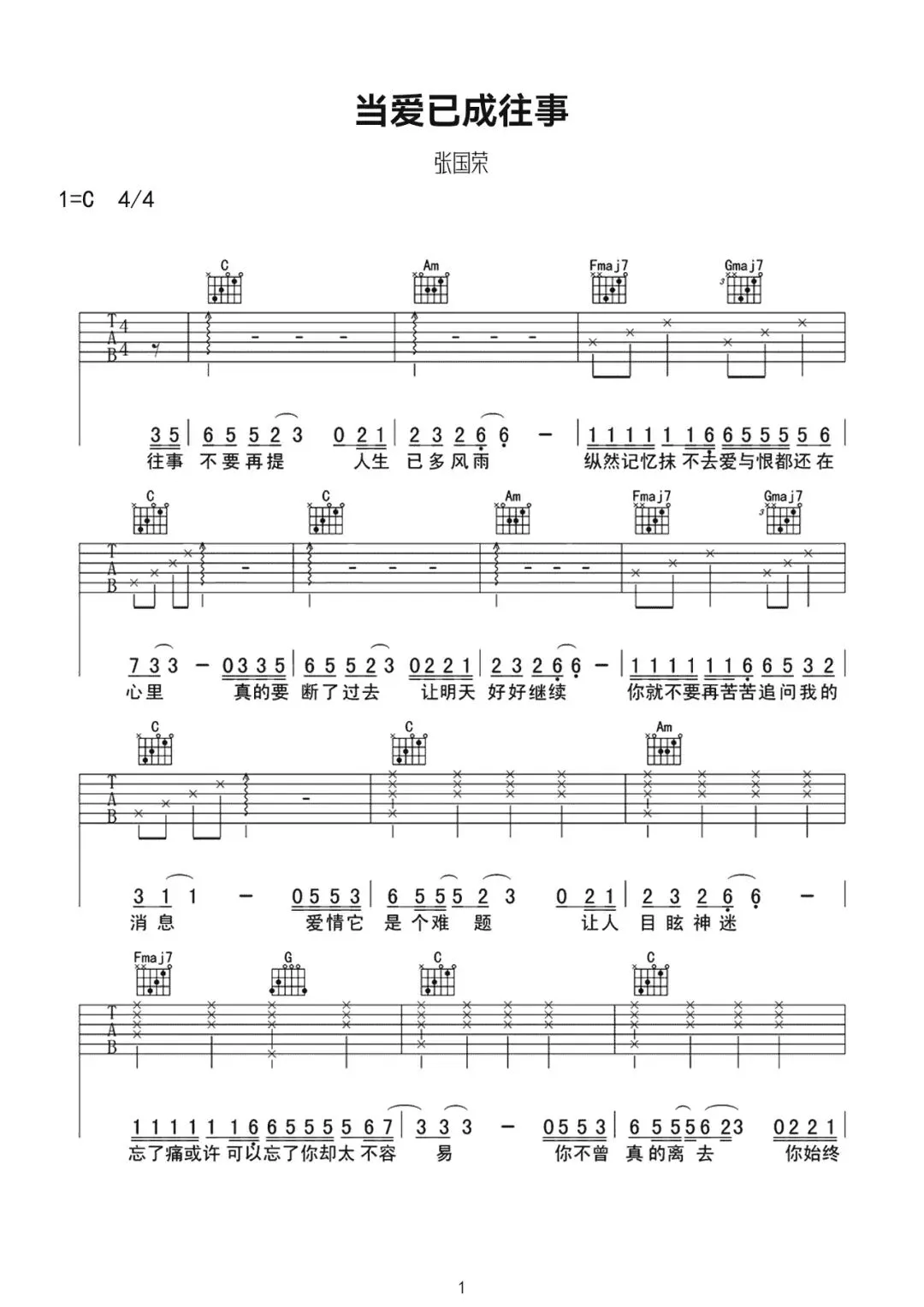 张国荣《当爱已成往事》吉他谱