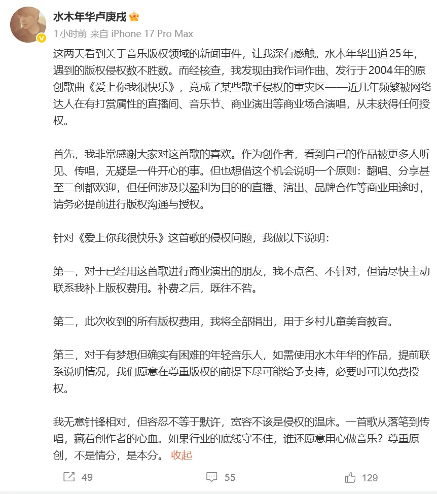 首先,我非常感谢大家对这首歌的喜欢。作为创作者,看到自己的作品被更多人听见、传唱,无疑是一件开心的事。但也想借这个机会说明一个原则:翻唱、分享甚至二创都欢迎,但任何涉及以盈利为目的的直播、演出、品牌合作等商业用途时,请务必提前进行版权沟通与授权。针对《爱上你我很快乐》这首歌的侵权问题,我做以下说明:第一,对于已经用这首歌进行商业演出的朋友,我不点名、不针对,但请尽快主动联系我补上版权费用。补费之后,既往不咎。第二,此次收到的所有版权费用,我将全部捐出,用于乡村儿童美育教育。第三,对于有梦想但确实有困难的年轻音乐人,如需使用水木年华的作品,提前联系说明情况,我们愿意在尊重版权的前提下尽可能给予支持,必要时可以免费授权。我无意针锋相对,但容忍不等于默许,宽容不该是侵权的温床。一首歌从落笔到传唱,藏着创作者的心血。如果行业的底线守不住,谁还愿意用心做音乐?尊重原创,不是情分,是本分。水木年华,中国民谣乐队,名字取自于“水木清华”,前后共有六位成员,均是清华大学毕业生,目前由卢庚戌、缪杰、陈秋桦、于盛组成。2001年4月,卢庚戌、李健创立了水木年华。2002年,李健退出并单飞,随后缪杰、姚勇加入,水木年华成为三人组合。2003年9月,姚勇离队,水木年华以卢庚戌、缪杰二人组合的形式继续展。2021年,陈秋桦加入,水木年华以三人乐队的形式发展。2024年5月25日,于盛加入,水木年华以四人乐队的形式发展。