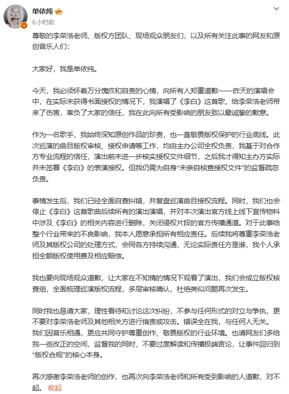 3月30日凌晨1点08分,单依纯发文道歉。她称此次巡演的曲目版权审核、授权申请等工作,均由主办公司全权负责,自己演出前未进一步核实授权文件细节,之后才得知主办方实际并未签署《李白》的表演授权。“但我仍需为自身‘未亲自核查授权文件’的监督疏忽负责。”