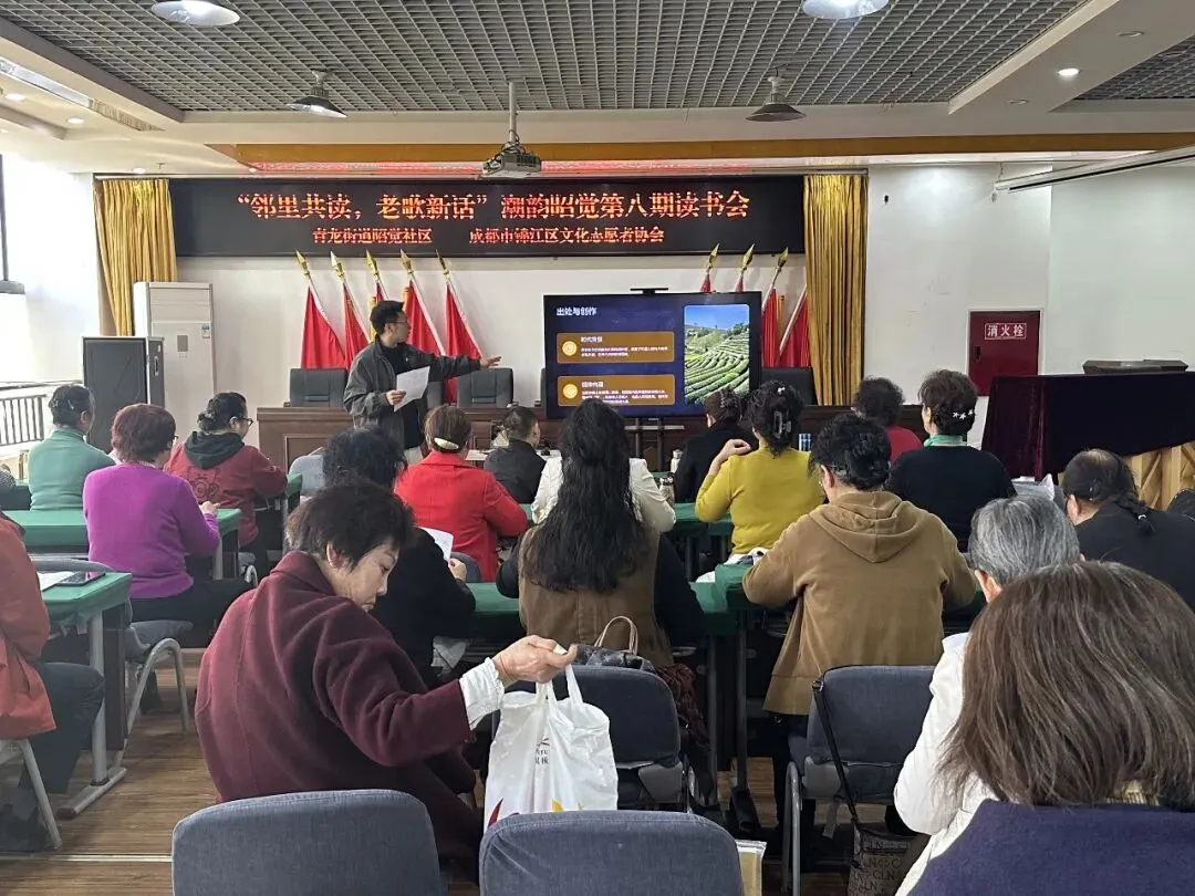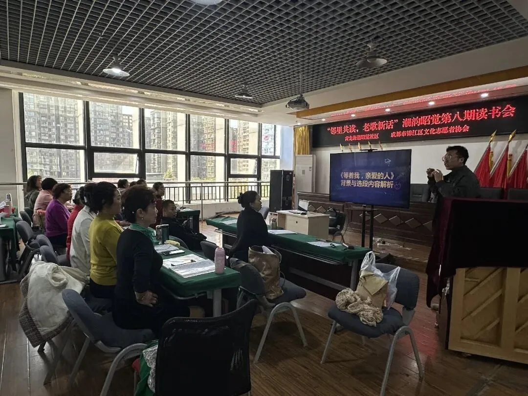2026年3月31日下午,由青龙街道昭觉社区主办,成都市锦江区文化志愿者协会承办的“邻里共读,老歌新话”潮韵昭觉第八期读书会,在社区党群服务中心五楼活动室顺利举行,辖区40余位中老年居民参与。
