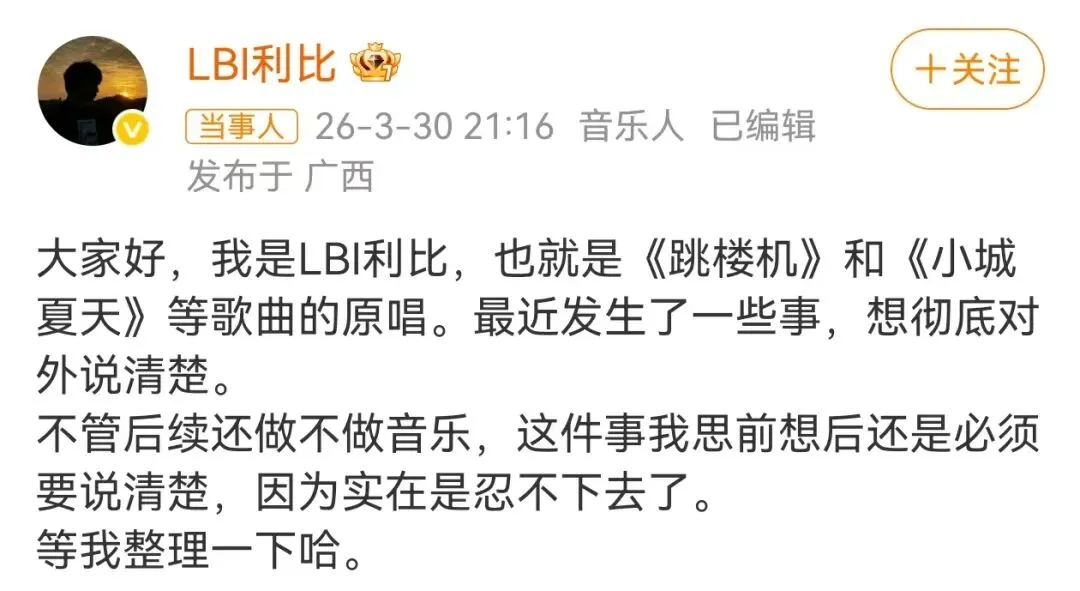据公开资料,利比,本名时柏尘,1994年11月19日出生,中国内地90后原创音乐人、歌手、音乐制作人、混音师及自媒体创作者,代表作品包括《小城夏天》《或许》《跳楼机》《洛杉矶》等。