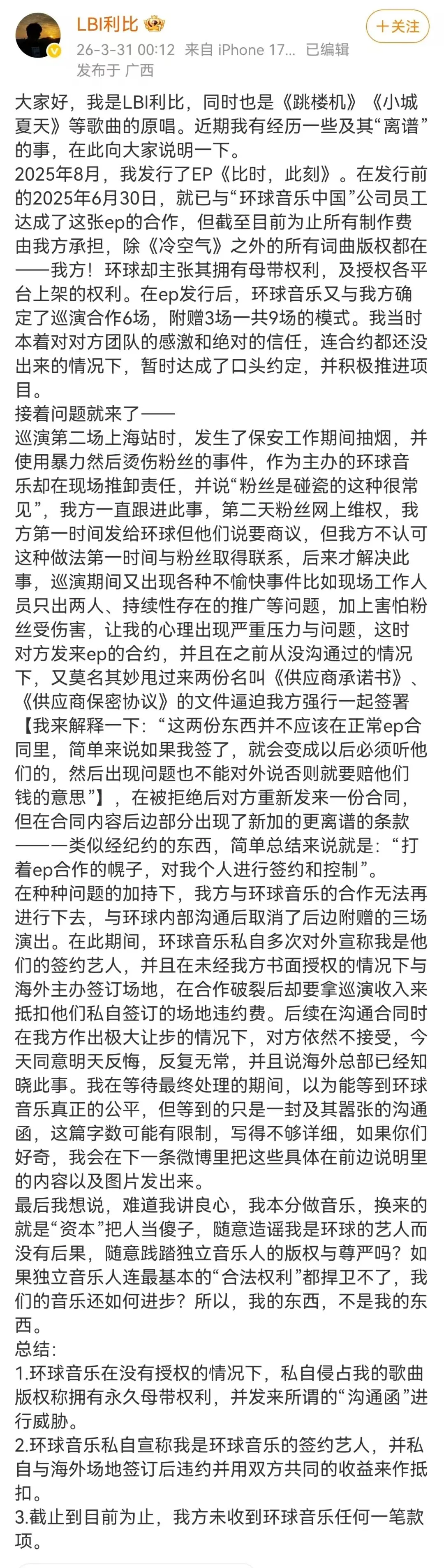 2.环球音乐私自宣称利比是环球音乐的签约艺人,并私自与海外场地签订后违约并用双方共同的收益来作抵扣。