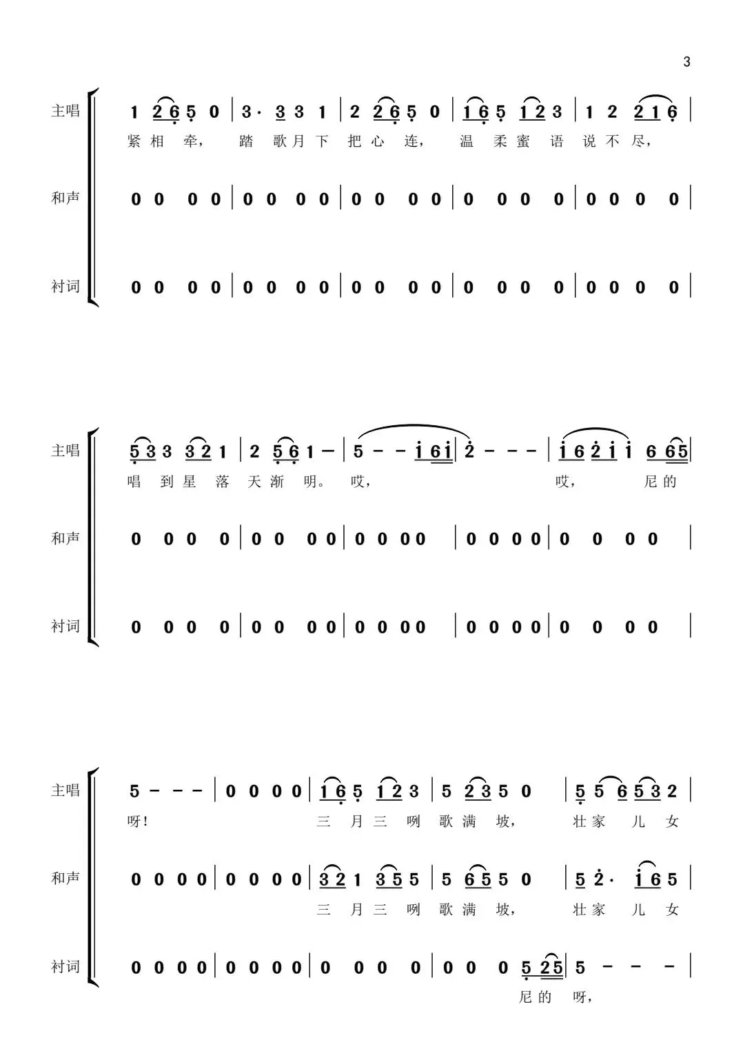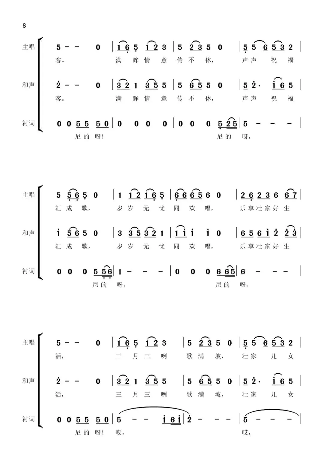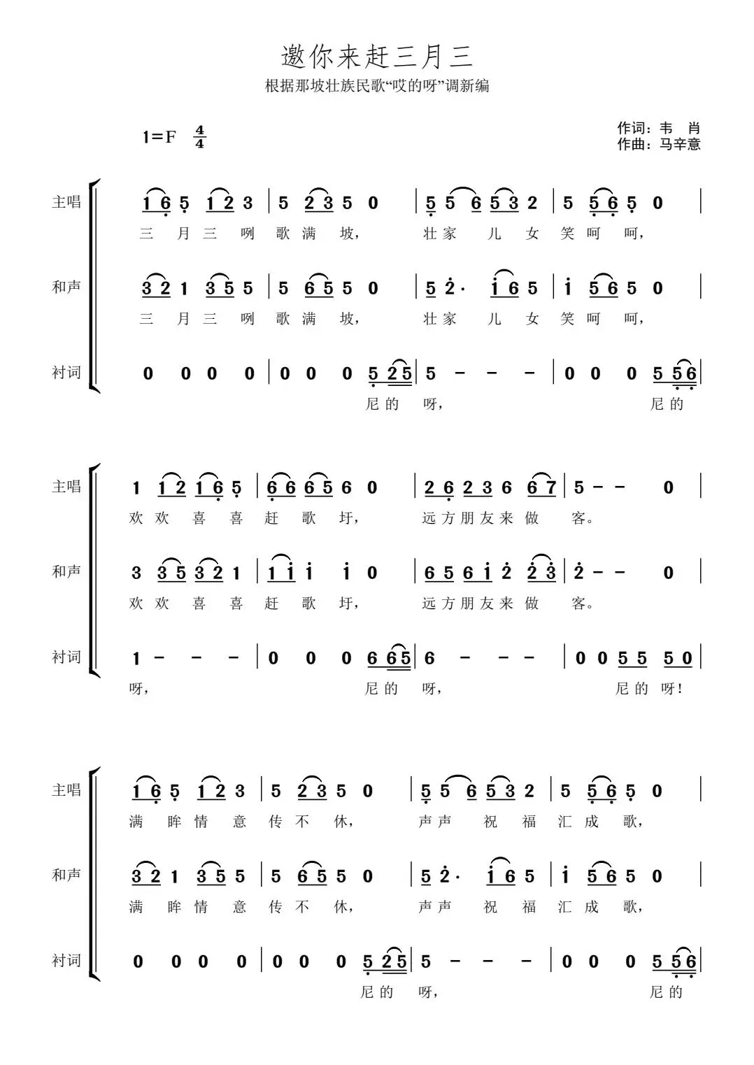 我落笔时,脑海里满是壮乡三月三的热闹图景:漫山的歌声此起彼伏,广西儿女身着盛装笑靥如花,歌圩之上,老中青少同唱山歌,绣球传情、铜鼓声声,五色糯米饭的香甜在风里飘荡,八方宾客踏歌而来,与壮乡人一同沉醉在这欢乐之中。于是便有了“三月三咧歌满坡,壮家儿女笑呵呵”的直白吟唱,我想以最质朴的文字,勾勒出节日里最真切的欢喜,让听者一眼便能望见那片歌海欢腾的壮乡天地。而“欢欢喜喜赶歌圩,远方朋友来做客”,则是壮乡人刻在骨子里的热情,歌圩从不是独属于壮乡的狂欢,而是向世界敞开的怀抱,每一个远道而来的人,都能在这里感受到最纯粹的真诚与温暖。