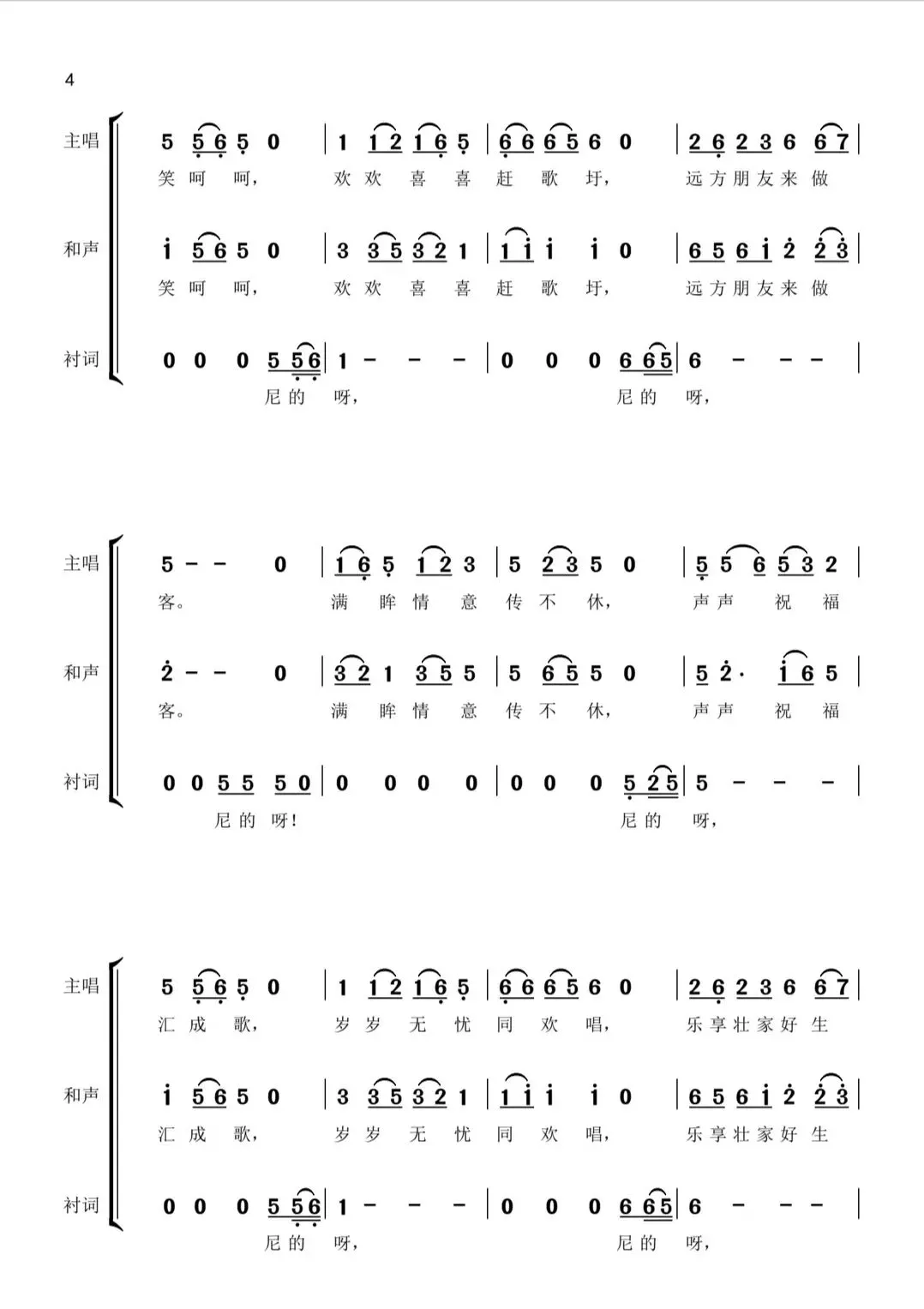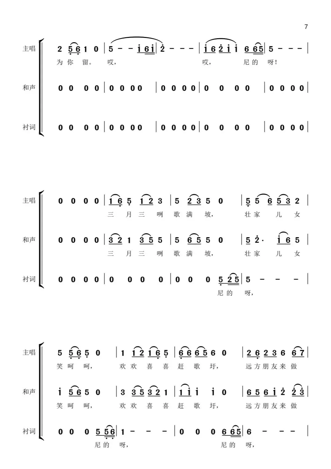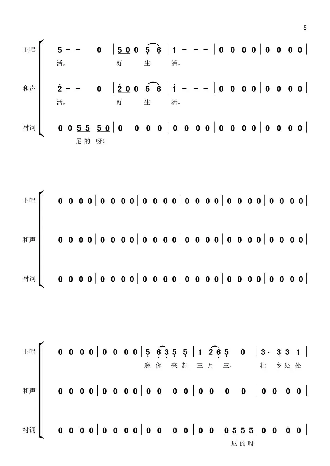 我落笔时,脑海里满是壮乡三月三的热闹图景:漫山的歌声此起彼伏,广西儿女身着盛装笑靥如花,歌圩之上,老中青少同唱山歌,绣球传情、铜鼓声声,五色糯米饭的香甜在风里飘荡,八方宾客踏歌而来,与壮乡人一同沉醉在这欢乐之中。于是便有了“三月三咧歌满坡,壮家儿女笑呵呵”的直白吟唱,我想以最质朴的文字,勾勒出节日里最真切的欢喜,让听者一眼便能望见那片歌海欢腾的壮乡天地。而“欢欢喜喜赶歌圩,远方朋友来做客”,则是壮乡人刻在骨子里的热情,歌圩从不是独属于壮乡的狂欢,而是向世界敞开的怀抱,每一个远道而来的人,都能在这里感受到最纯粹的真诚与温暖。
