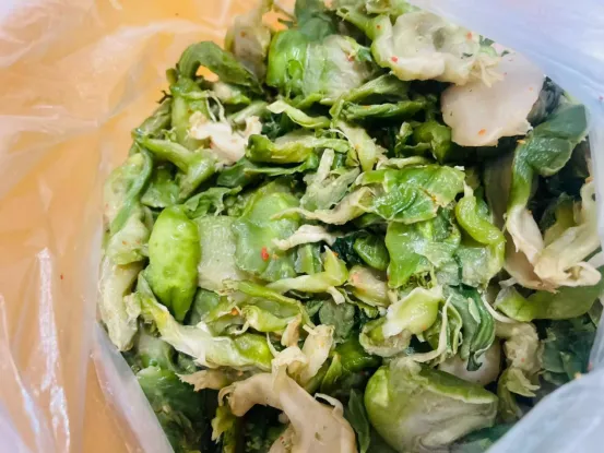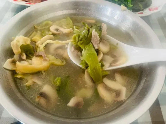 而盐菹(zu)则又是另一种极为简洁的方法,它也是腌制方法的一种。比方说你可以将采摘下来的鸡脚芥粗略的选取较嫩的茎叶部分,洗净后置于盆中,再撒适量食盐,反复揉搓至芥菜出水,然后让其在盆中搁置一个晚上,这就是所谓的菹(zu),乡下人管这种方法做出来的芥菜叫“水咸菜”。盐菹可以有效的去除芥菜的辛辣和苦涩。等到要做菜的时候,取出部分洗净盐分,切碎后与肉丝或春笋等炒制,脆爽嫩滑,落口甘辛,味道极其鲜美,是江南农村平常应急的一道家常菜。尤其是你将“水咸菜”和鲜嫩的猪血、白净的蘑菇烧煮成一份鲜汤,那才叫汤品中的绝绝子。芥菜自带清甜的特质,在这份鲜汤中表现得畅快淋漓。真可谓“ 寻常蔬食里,亦见物精华。”