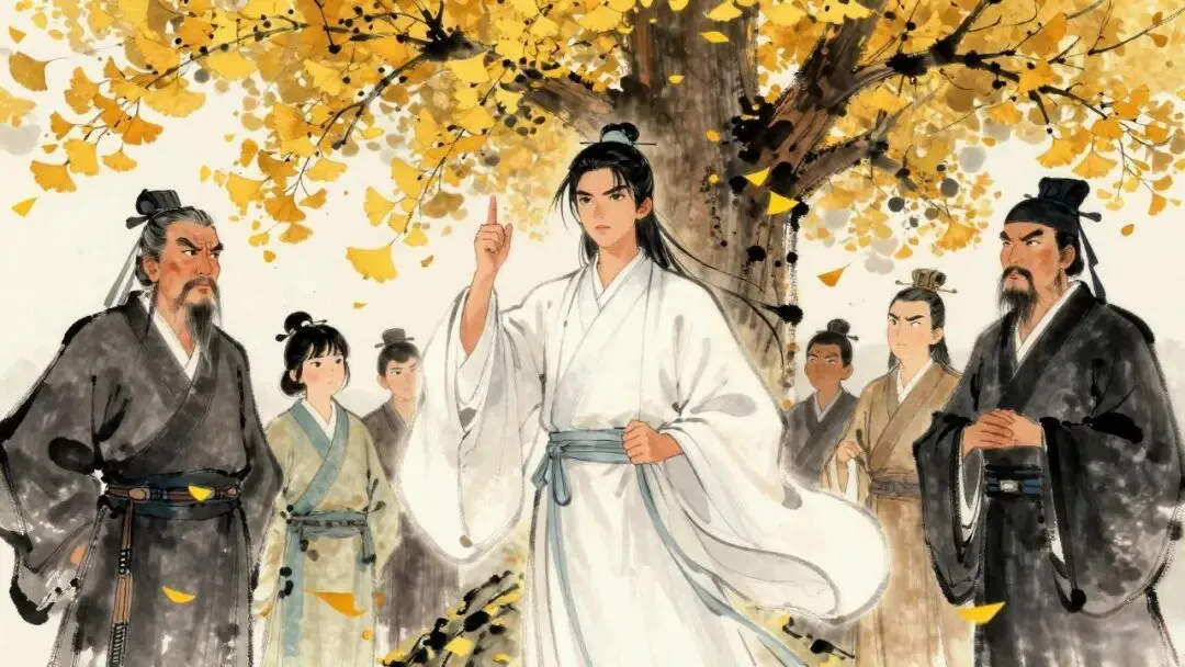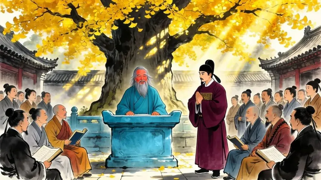 李白沿着石阶一步一步向上走,迈进了观门,前院十分宽敞,已经聚集了几十个人,里面有穿着道袍的道士,有戴着纶巾系着博带的儒生,也有穿着华丽衣袍的绅士,大家围绕着院子里一棵巨大的银杏树坐在一起,目光都集中在树下的一方青石讲坛上。