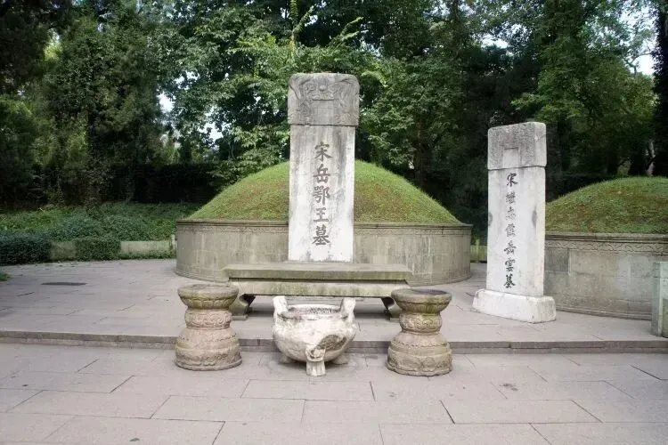 从赵孟𫖯诗中“秋日荒凉石兽危”的倾圯景象来看,这首诗或作于宋元鼎革后不久,元兵入浙,岳庙建筑毁于兵火,再加上寺僧中有放荡不守戒律的,典售毁折,无所不为,使岳庙坟荒寺废,业属他人,此诗首联“鄂王坟上草离离,秋日荒凉石兽危”,以岳坟的荒芜景象起兴,暗寓诗人伤痛之情:离离秋草丛中,鄂王坟满目凄凉,墓前的石兽翁仲,在萧瑟西风中冷峻肃立。“鄂王”,是南宋嘉泰四年(1204)朝廷追封给岳飞的王爵。王爵为宋代最高一等爵级,封的王爵,必须挂国名。“鄂王”的“鄂”为王国名,鄂国的地域范围在鄂州,鄂州的州治即今天的湖北武昌。岳飞是南宋初期中线防御的军事负责人,曾任湖北、京西路宣抚使,其宣抚司就设在鄂州。封国以“鄂”,寓有岳飞的功烈“与鄂相终始”之意。岳飞生前所获最高爵级为第六等的开国公,地望也在鄂州,称武昌郡开国公。1979年在重修岳墓时,曾对墓的外围和墓道进行发掘清理,发现地下墓基周围的旧条石还在,而在墓道两侧地下,则发现两具石俑。北面一具已残,南面一具基本完整。石俑头朝东,足向西,周围砌坎,身高213厘米,表面风化严重,露出石筋,面相长圆,衣纹简朴,和飞来峰宋代造像的风格接近。从石俑的雕刻风格、石质风化程度以及服饰等方面鉴定,属于南宋遗物。按照宋代的墓葬礼仪制度,三品以上大臣的墓葬,除有石羊、石虎、望柱各二外,还有两具石俑。这两具发掘出来的南宋石俑正是当年南宋朝廷以礼改葬岳飞于今址的实物见证。