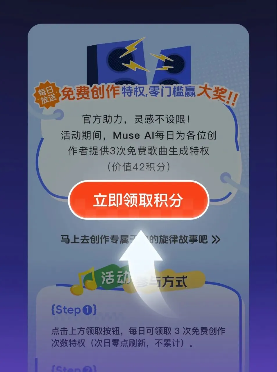 下载Muse AI后,在首页点击banner进入活动页面,领取每日创作特权!