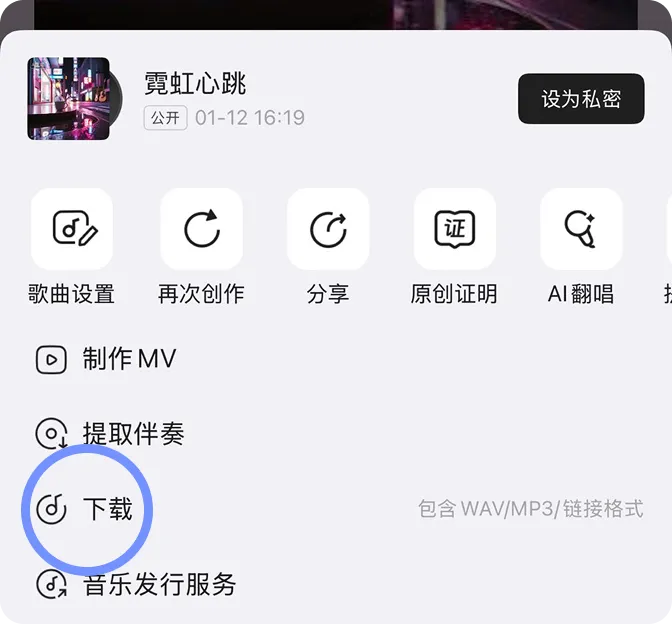 创作完成后,返回活动页面,点击页面下方【立即参加】按钮,选中你满意的作品进行提交,即可免费解锁该歌曲的专属下载通道,将音频保存至手机。