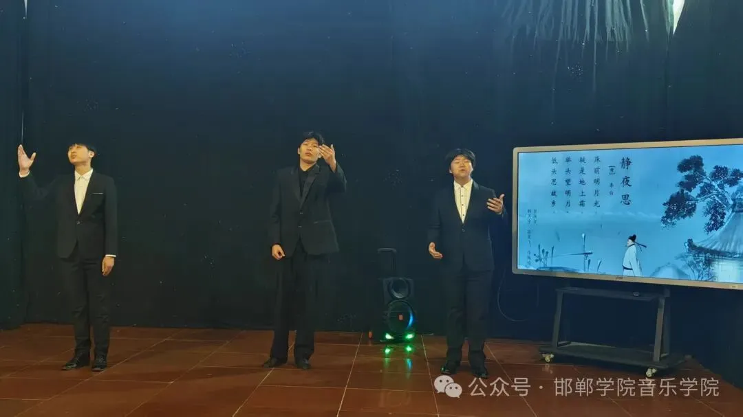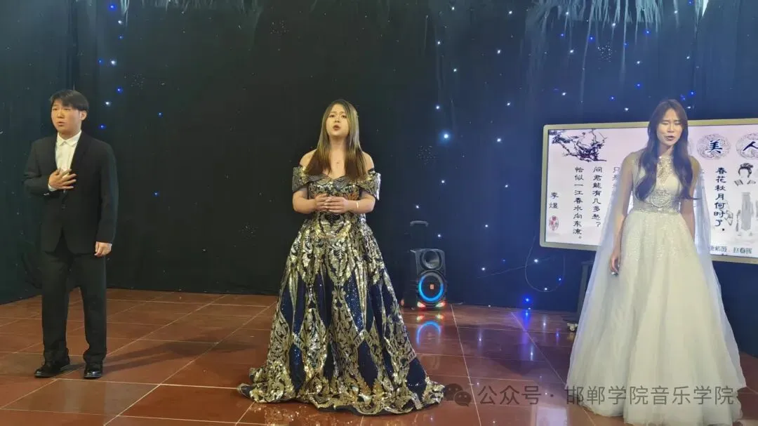 2025年4月24日下午,邯郸学院音乐学院邵凌春老师带领学生在盛景音乐厅成功举办《诗乐和鸣——中国古典诗词歌曲讲解音乐会》。本次音乐会以“诗乐交融,美育铸魂”为核心理念,将古典诗词与声乐艺术深度结合,同时融入美育浸润、师范能力培养与思政教育元素,打造了一堂别开生面的“行走的课堂”。