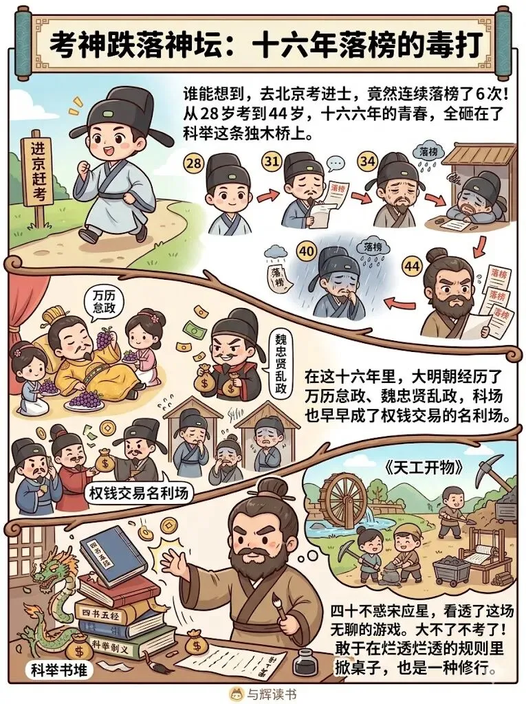 六次落第,对宋应星的打击是毁灭性的。在当时,三十老明经,五十少进士,年过四十仍未中进士的宋应星,逐渐看透了科举制度的腐朽与无望。