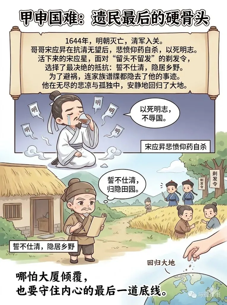宋应星的哥哥宋应昇,在目睹抗清无望后,悲愤交加,仰药自尽,以为明朝殉节。兄长的死,像一记重锤砸在宋应星的心上。那个曾经和他并肩走过南昌贡院、一起六上京师的兄长,用最决绝的方式捍卫了士人的尊严。