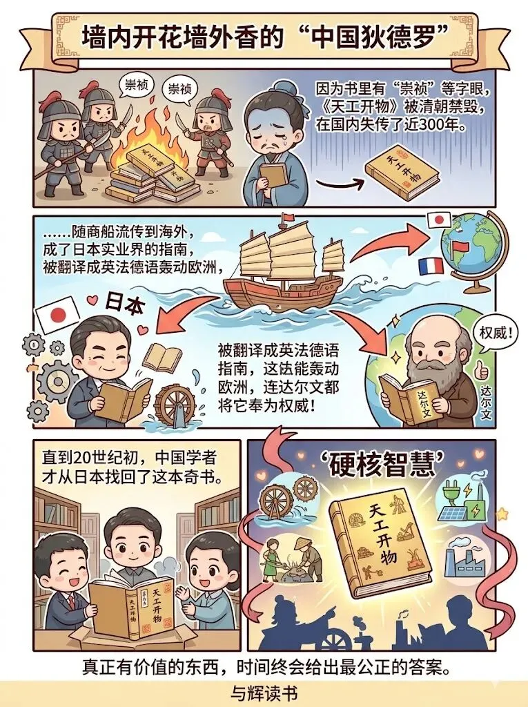 宋应星死后,由于《天工开物》中多处使用了“崇祯”年号,且保留了“北虏”(指代清朝前身)等令满清统治者极其敏感的字眼,这部书在清代遭到了严厉的封禁和销毁。在长达近三百年的时间里,这部科技巨著在它的母国——中国,几乎彻底失传,仅仅在《古今图书集成》等皇家典籍中被暗中抄录了部分章节。