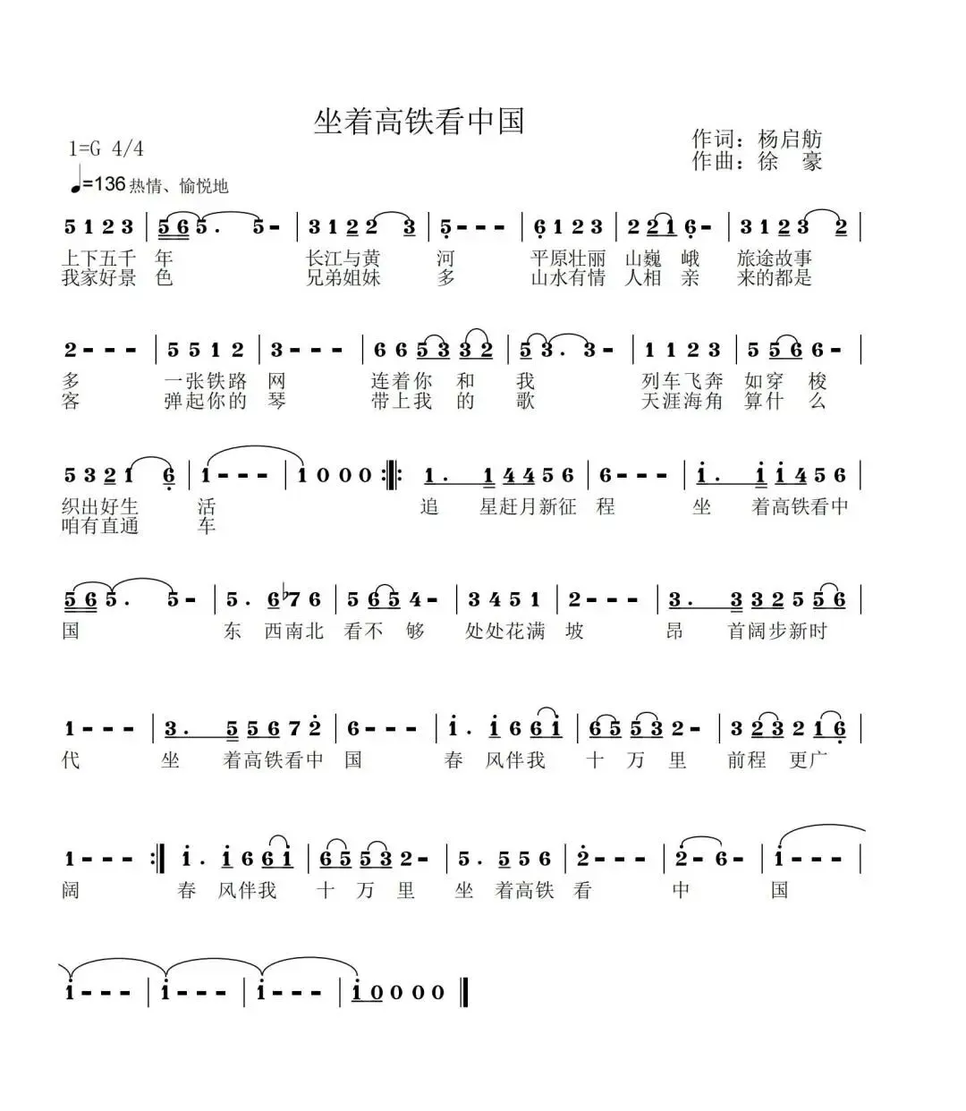 歌曲《坐着高铁看中国》再现了旅客坐着高铁享受美好旅行生活的场景,反映了中国铁路发展成就特别是“八纵八横”高铁网建设成就,表达了新时代人民群众满满的获得感、幸福感和自豪感,展示了山河无恙、家国共圆、风景这边独好的中国气派。作品把“坐高铁”和“看中国”两个元素有机结合起来,从上下五千年的悠久文明唱起,以“追星赶月新征程”礼赞新时代前程广阔。