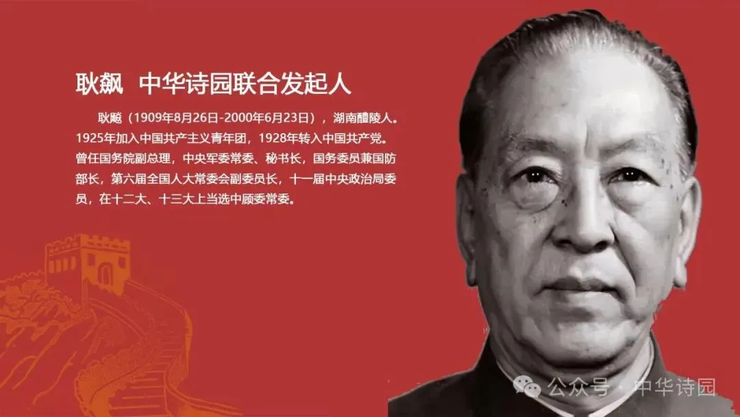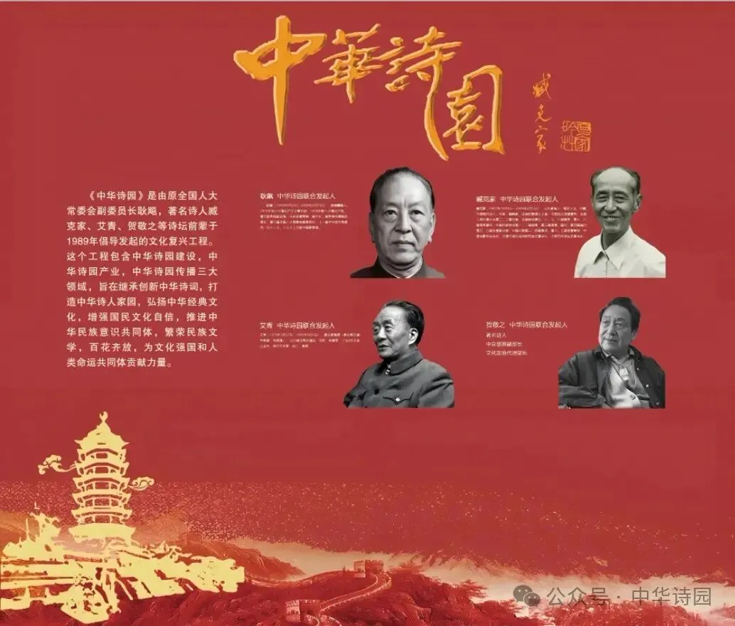 《中华诗园》是由原全国人大常委会副委员长耿飚,著名诗人臧克家、艾青、贺敬之等诗坛前辈于1989年倡导发起的文化复兴工程。这个工程包含中华诗园建设,中华诗园产业,中华诗园传播三大领域,旨在继承创新中华诗词,打造中华诗人家园,弘扬中华经典文化,增强国民文化自信,推进中华民族意识共同体,繁荣民族文学,百花齐放,为文化强国和人类命运共同体贡献力量。