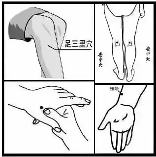 四总穴歌:肚腹三里留,腰背委中求,头项寻列缺,面口合谷收