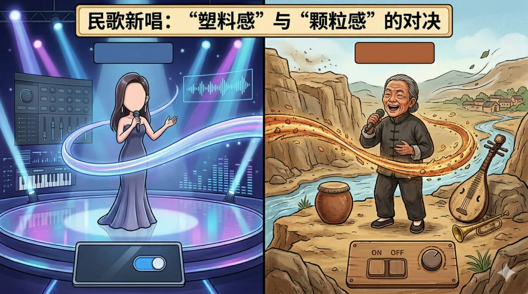 “塑料感”,是过度修音带来的虚假光滑,是民乐被电子合成器粗暴替代的廉价,是千篇一律“民通唱法”抽干了灵魂的地域特色。