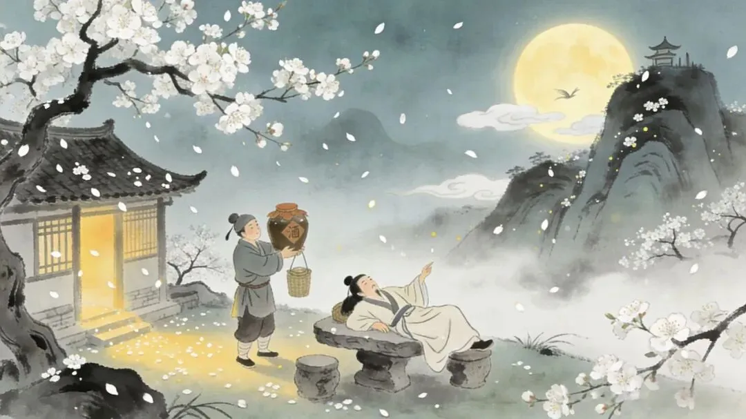 喝醉了在明月光照下呼呼入睡,梦中乘兴到天台山一游,好不惬意!