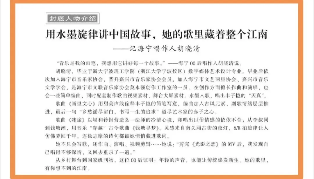 2026年4月,嘉兴市青年唱作人胡晓清荣登《歌曲》封面人物。