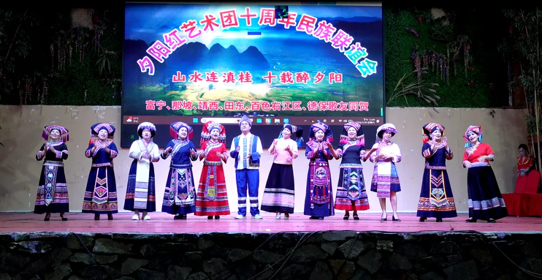 ▲德保夕阳红艺术团领衔,各族歌友同台伴唱,传递团结互助的深厚情谊。(卢春耀 摄)