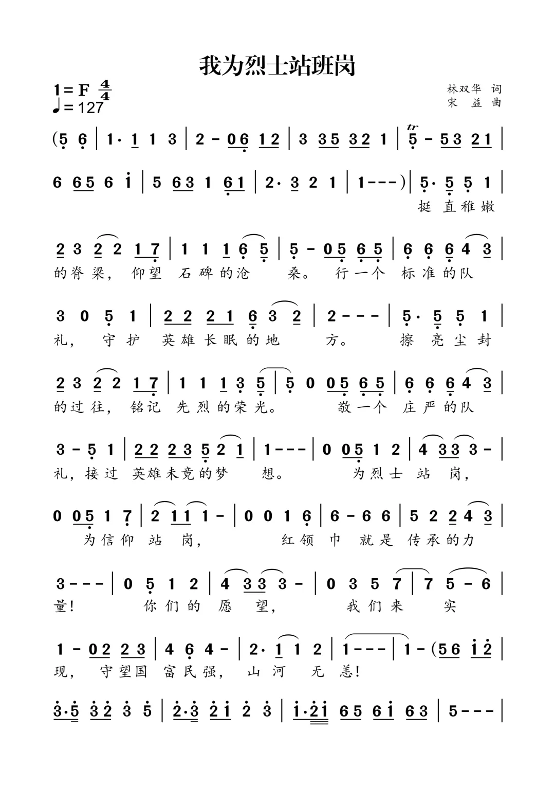 在2026年3月27日,福建省“百园千校清明祭英烈”启动仪式上,莆田市少先队员以“我为烈士站班岗”的实际行动,缅怀革命先烈,感悟英烈精神,赓续红色血脉。中国音乐家协会会员、莆田晚报社总编辑林双华同志深受感动,连夜创作歌词《我为烈士站班岗》,并邀请音乐界等爱心人士谱曲,制作MV。福建省退役军人事务厅、共青团福建省委予以联合发布,希望广大青少年广泛传唱这首原创歌曲,推广少先队员为烈士站班岗这一红色教育新模式,在全社会形成尊崇英烈、学习英烈的浓厚氛围,让红色基因代代相传。