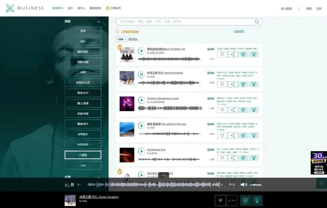 MUSINESS音乐素材网(www.musiness.vip),聚合了约300,000首优质大牌音乐、配乐、音效曲库及配音cv声展区,含数百位好莱坞音乐制作人作品,是世界经典名曲《班得瑞》全部15张专辑在中国大陆地区的独家授权代理。广告配乐、短视频背景音乐、元宇宙空间环境音乐、影视配乐、游戏BGM、动漫BGM等需求均可在MUSINESS音乐素材网中依据标签和关键词搜索下载,并获得音乐授权使用证书。MUSINESS音乐素材网开放了部分免费音乐曲库,让用户尽情享受正版音乐商用的自由。