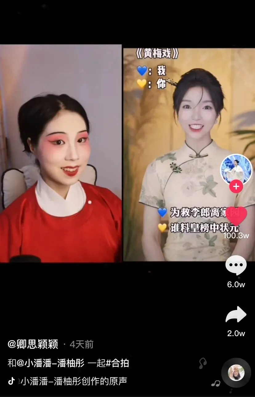 #这是正宗的黄梅戏吗#这一带有质疑意味的话题随即登上抖音热榜,在该词条下,也有不少具有戏曲专业背景的音乐人,以传统戏腔的演唱方式与小潘潘跨屏合拍,力图为黄梅戏正名。