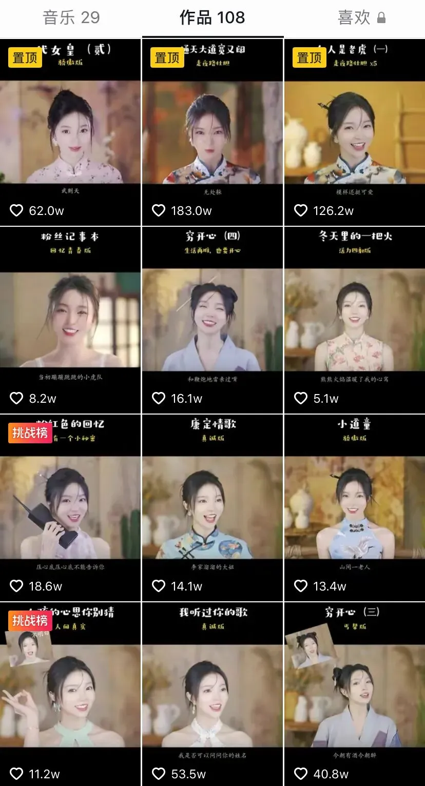 点开小潘潘的抖音账号主页,划动几番,我们很快就能总结出小潘潘翻唱作品的风格。