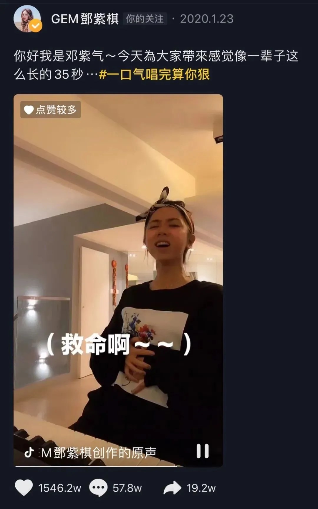 今年,抖音上颇为流行唱《公子呀》不换气的短视频挑战,吸引了大小抖音KOL参与。被称为“巨肺”的歌手邓紫棋一边喊着“救命啊”,一边挑战了35秒不换气,获得了超过1500万的点赞量。