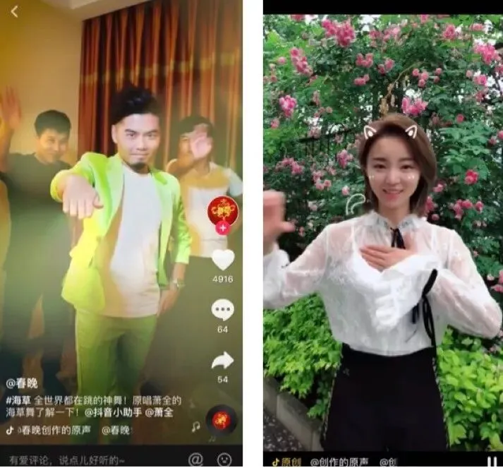 萧全(左)的《海草舞》和小潘潘(右)的《学猫叫》红遍抖音。来源:抖音截图
