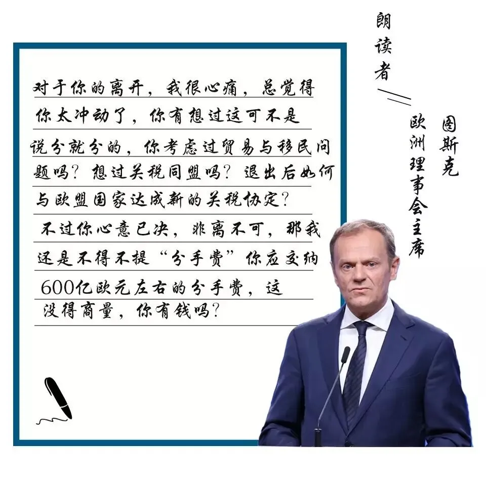 前面这些感性的文字和百般的不舍,你被打动了吗?以为这是一场平静的分手?可双方有着剪不乱理还乱的关系,对英国和欧盟来说,一场漫长的战役才刚刚开始。