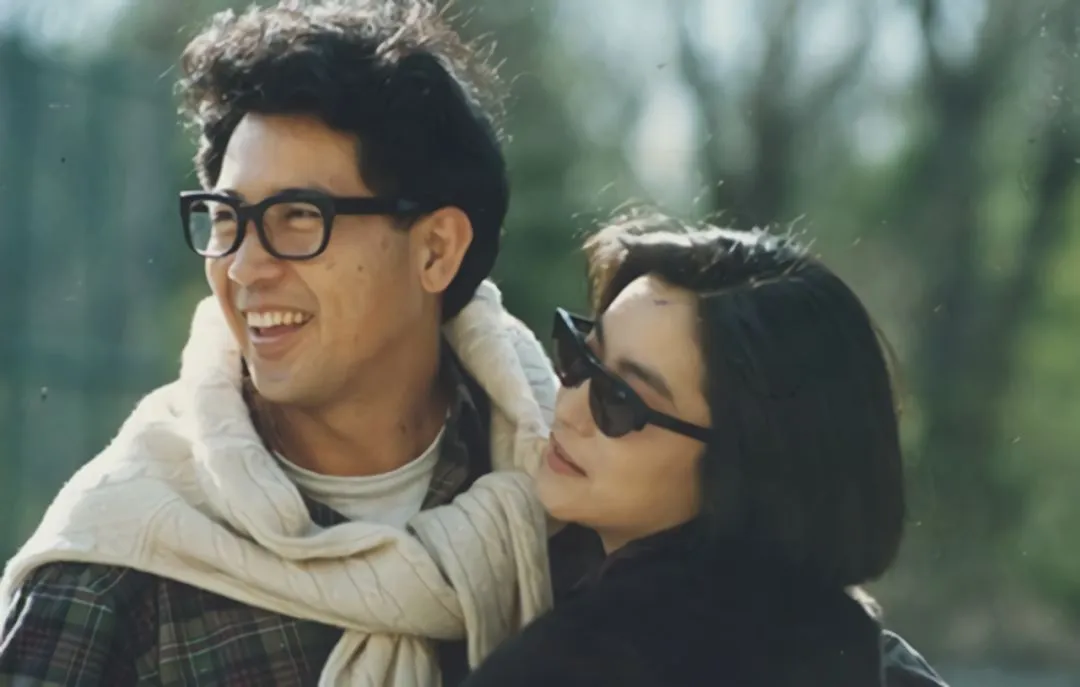 在大银幕上,林青霞同秦汉耳鬓厮磨,咬着耳朵说情话,赤脚踩着他的皮鞋,就这样同他一路跳舞到阳台,用一张红头巾,蒙住两人浓情蜜意的吻——