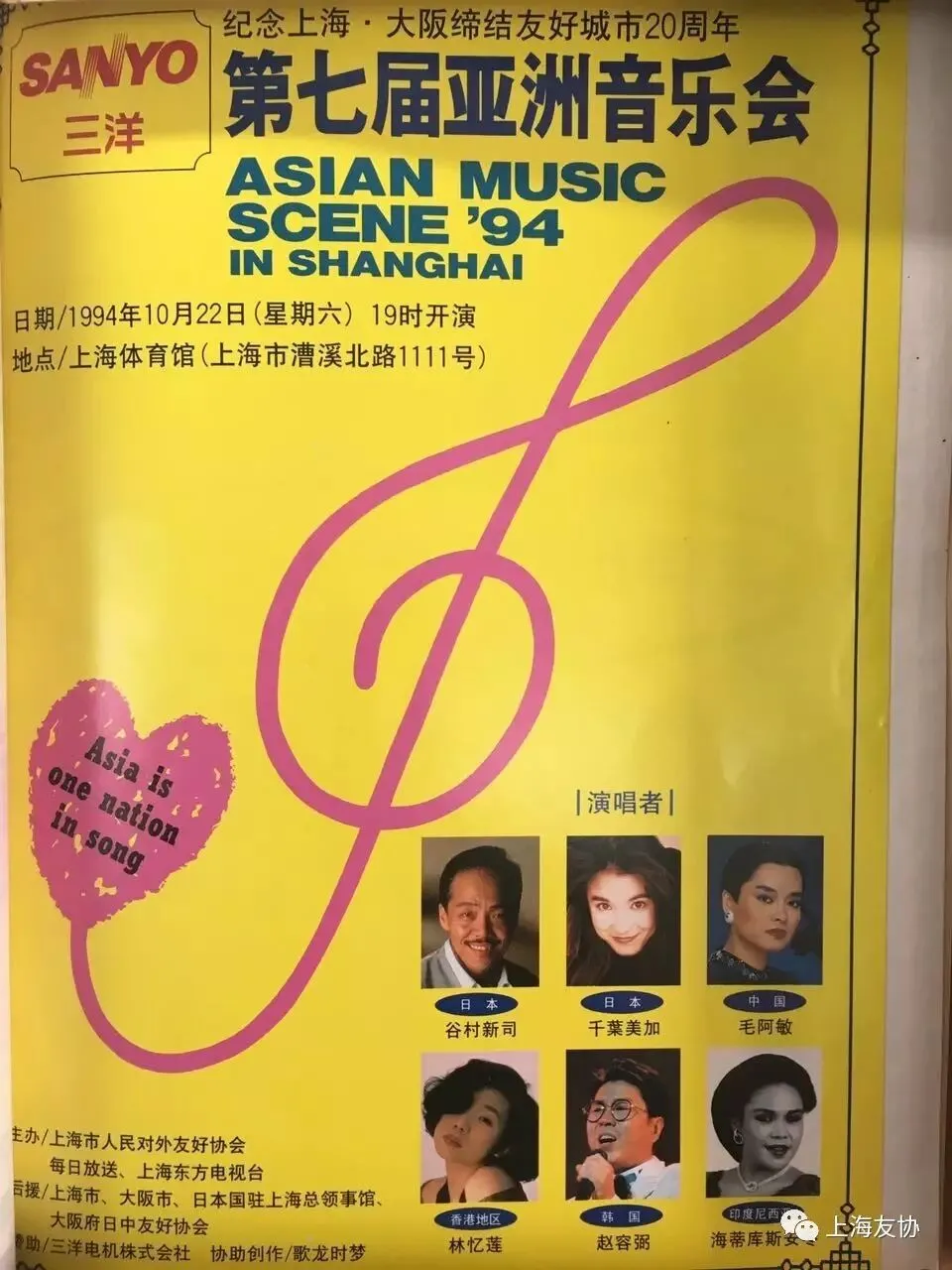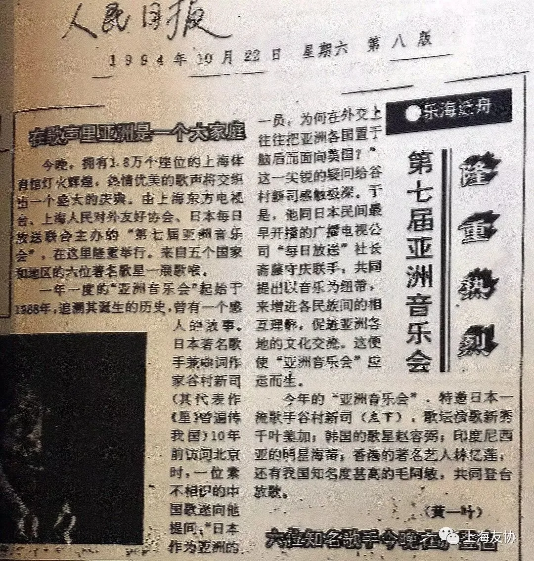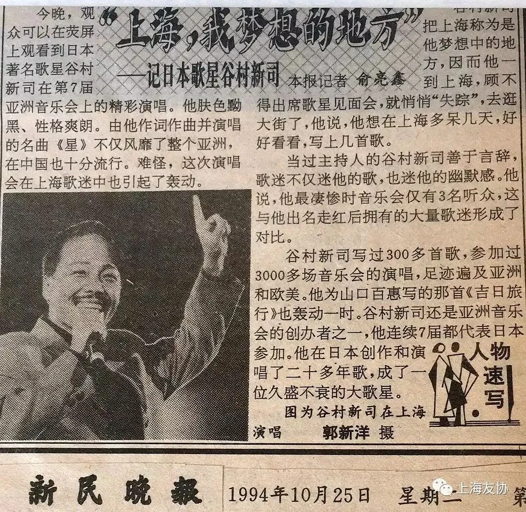 1994年10月,上海市人民对外友好协会、每日放送、上海东方电视台共同主办“纪念上海▪大阪友好城市缔结20周年 亚洲歌星汇演音乐会”,出生于日本大阪的谷村新司来沪献演。
