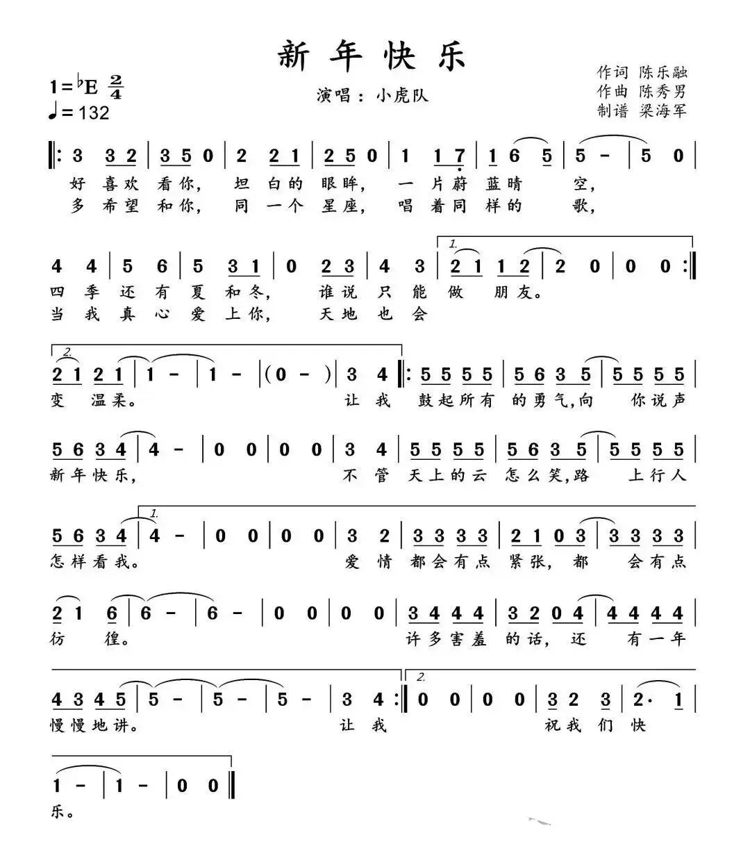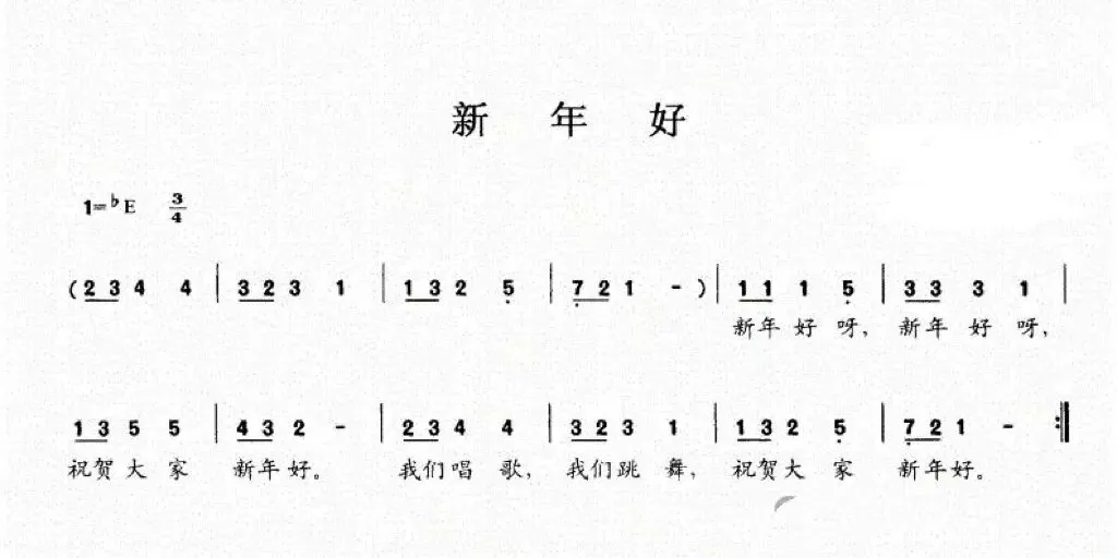 《新年好》是一首英国儿歌,3/4拍子,F大调,由两个乐句构成的一段体结构。曲调优美、流畅,表现了人们在新年来临时欢欣鼓舞,互相祝福的心情。