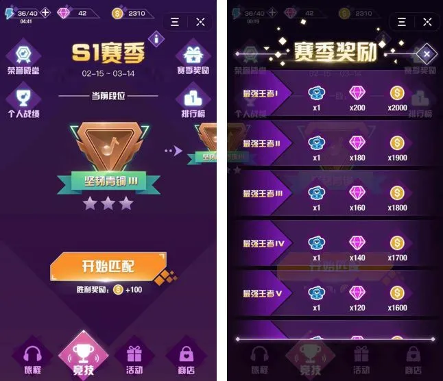 除了普通的闯关模式,游戏还设计了竞技排位赛,玩家通过比赛可以获得游戏货币等奖励。