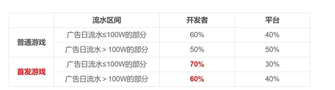 文件还顺便公布了游戏的广告分成比,只要有开发者来抖音发布游戏,开发者可以拿走,广告产生的盈利流水的大部分。