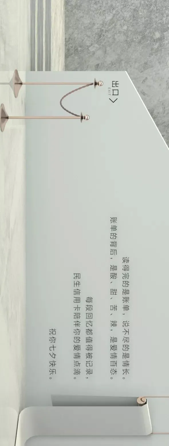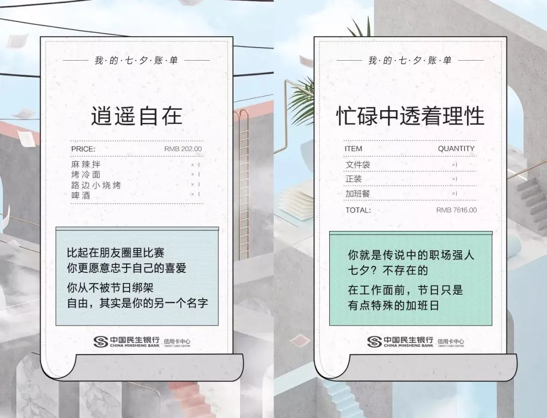 当“展览”逐渐成为品牌营销的手法之一,民生信用卡则别出心裁的以“账单”为主题,和用户一起呈现了这次的账单情话线上展,展中的每张账单、每个故事,都来自真实用户的七夕经历,细细阅读账单,也能体会到百态爱情,让人不禁感叹,原来爱情真的存在于生活的每个细节中。