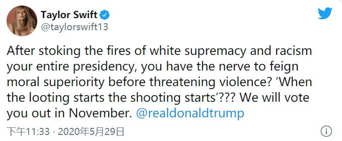 「你在位期间不一直都在煽动白人至上主义和种族主义的火焰吗,现在你还好意思在威胁使用暴力前假装自己有道德上的优越感?什么叫‘哪里有抢劫掠夺,哪里就有枪声音响起’???我们11月一定会投票换掉你。」