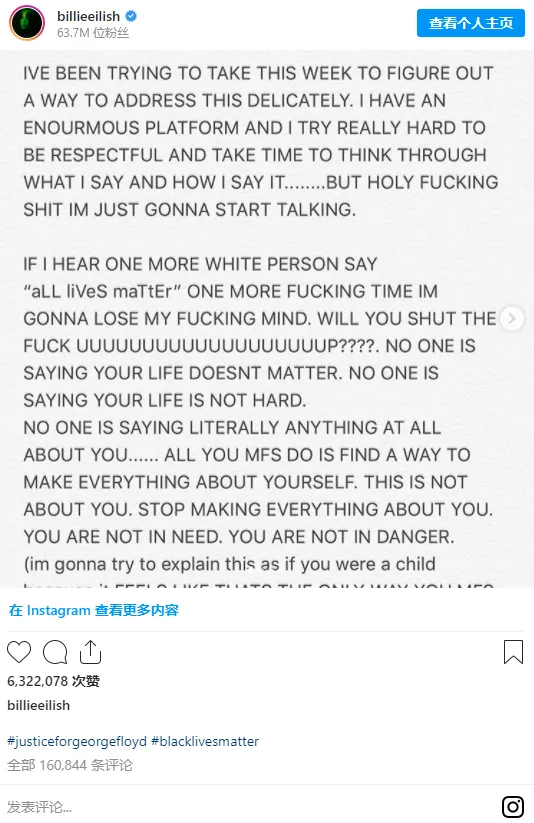 「……如果真的是All Lives Matter,那为什么只有黑人因为黑皮肤被杀?为什么移民会遭受迫害?为什么白人在被要求待在家里隔离的时候可以去游行甚至还能带着武器?为什么黑人在抗议同胞被无辜杀害时被称为暴徒? 你告诉我这是为什么?????因为tmd白人特权。 Black Lives Matter这个口号,并不是说其他人的命不重要,只是希望让人注意到我们这个社会tmd根本不在乎黑人的命!」
