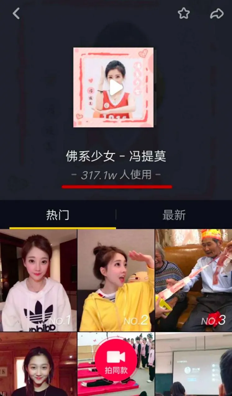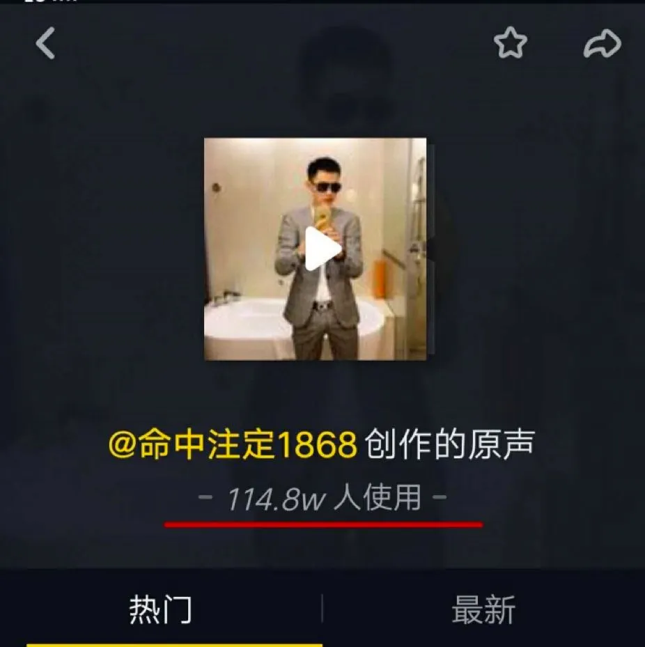 出现这种现象的一个重要原因是因为:在抖音的内容体系中,存在明显的“以某一音乐作为内容聚合单位”的设定。在今天抖音中还保留了一个以音乐作为搜索逻辑的引擎功能:每个短视频作品右下角都有该视频使用的背景音乐光标,点击这个标志,就会进入这个背景音乐的作者页面,会明确标识“该音乐被多少人使用”——这是抖音刚开始以“小众音乐和音乐创意聚合平台”作为定位时留下的宝贵遗产。