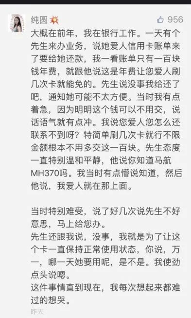 他平静的说,这张卡是他妻子的,而她的妻子在2014年3月8号乘坐马航MH370,至今未归。