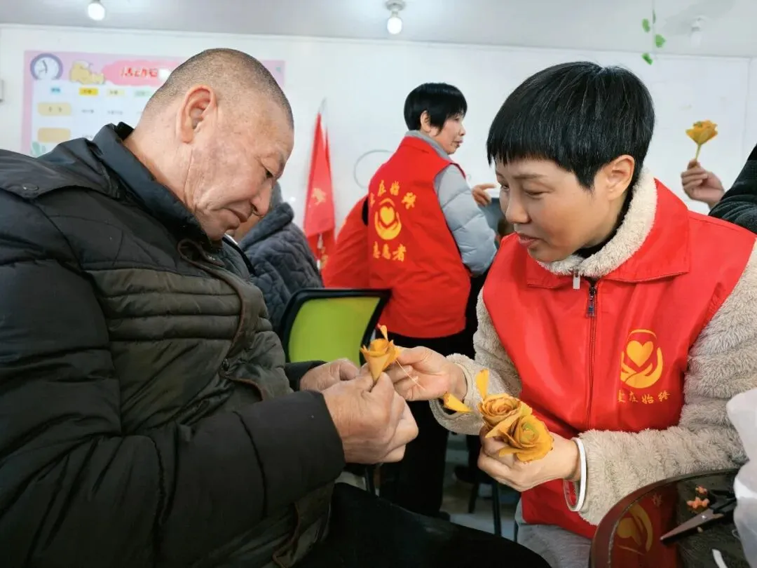 做完手工后,叔叔又拿着他的“作品”自豪地展示给其他志愿者看。接着,他转过头,带着一丝期待问我:“孩子,你会唱这些歌吗?我虽然字都记得,但调子好像有点记不清了,你能不能带个头,陪我唱唱?”
